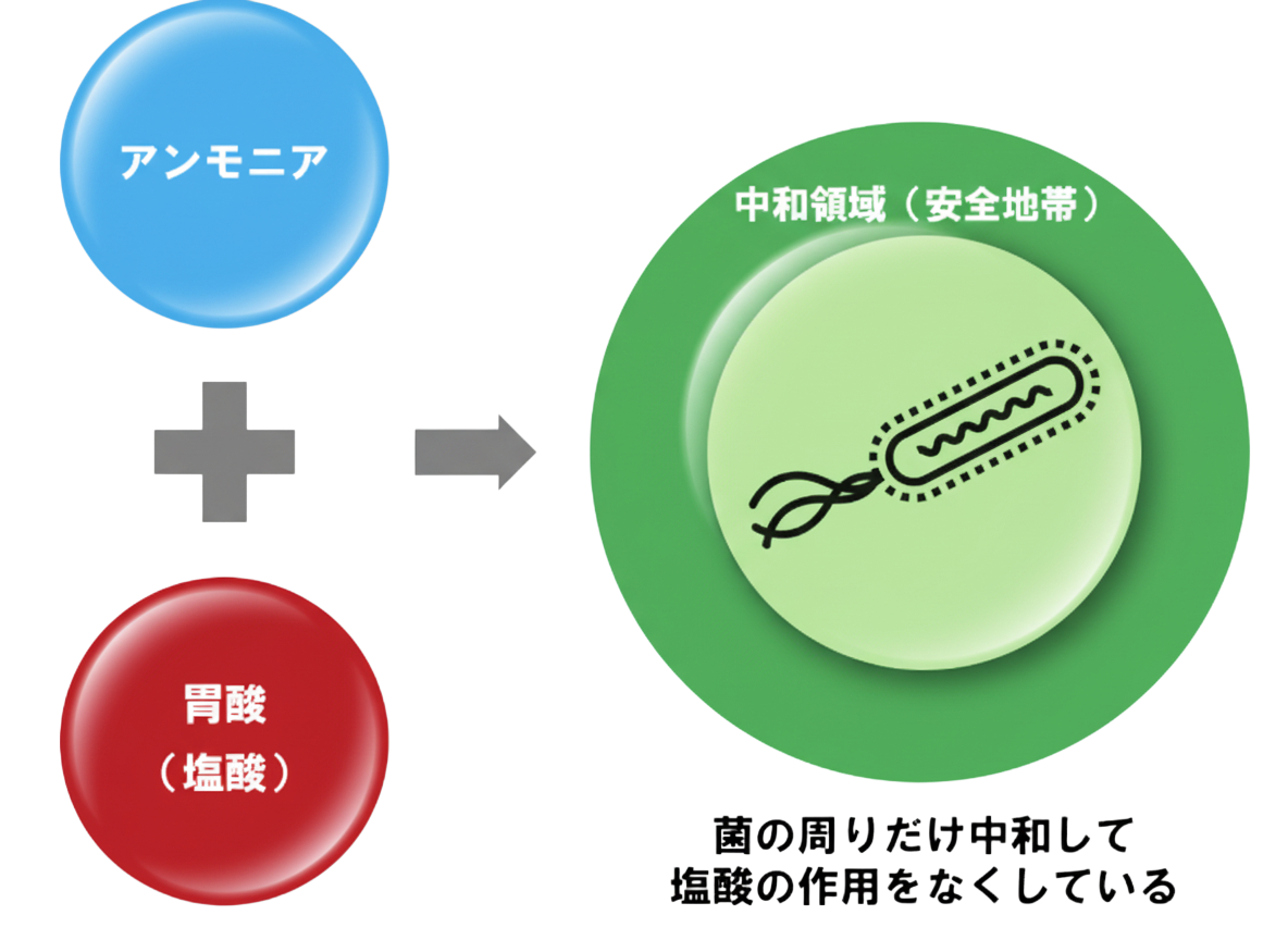ピロリ菌は胃を住処(すみか)にする細菌(バクテリア)です。大きさは4マイクロメートル、小さいので肉眼では見えません。 ピロリ菌は過酷な環境で生き抜く賢い戦略をもっています。胃は胃液(塩酸)によって非常に強い酸性の環境なので、普通の細菌は住めません。 しかしピロリ菌は、ウレアーゼという酵素をつかって、尿素をアンモニアと二酸化炭素に変えて、そのうちのアンモニアと塩酸を反応させて自分の周りの部分の胃酸を中和します。