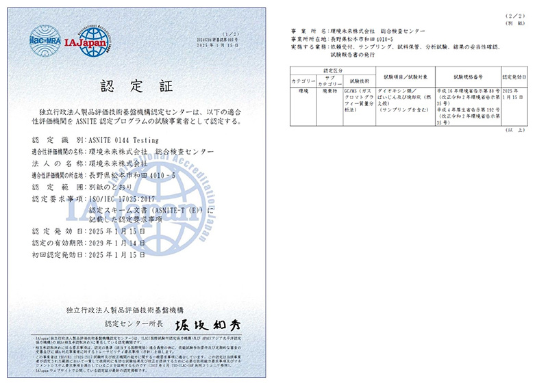 ISO/IEC17025:2017 ダイオキシン類/ばいじん及び焼却灰(燃え殻)(サンプリングを含む)に認定されました